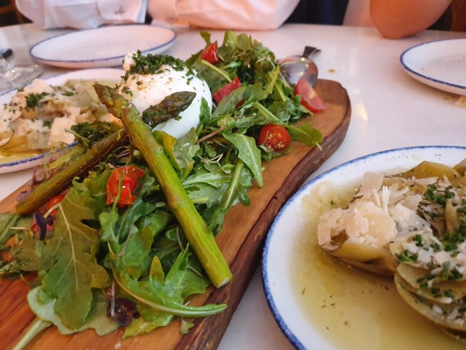 Empezamos con una deliciosa burrata, servida con ensalada y espárragos trigueros. Uno de nuestros platos favoritos, que desde luego no defraudó. Seguimos con unas alcachofas confitadas con lascas de parmesano riquísimas.