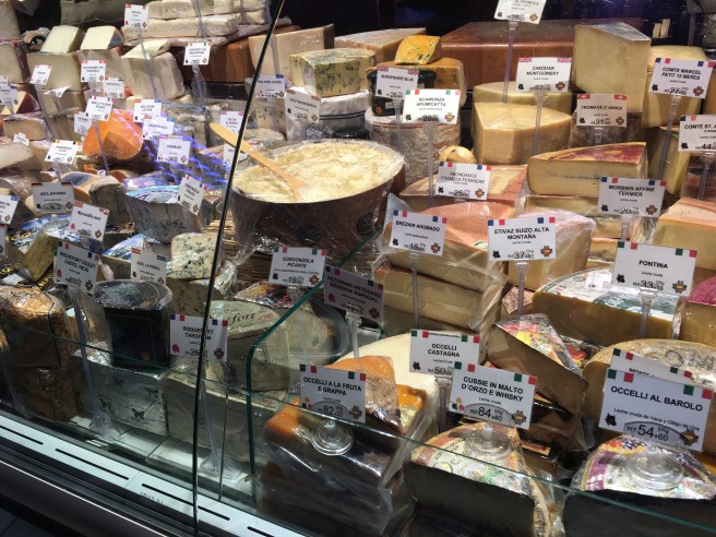 Y merecia mucho la pena. No es pequeña pero tiene ese caracter laberíntico de una buena librería pero con todas las estanterías repletas de cosas buenas. Quesos – todos los que puedas nombrar y mas – pero ademas panes recién horneados, vino , setas y hasta verduras. El olor es increíblemente apetitoso y los ojos casi no dan credito, y eso antes de darte cuenta que puedes sentarte para comer todo lo anterior en la cafeteria que tienen detrás!